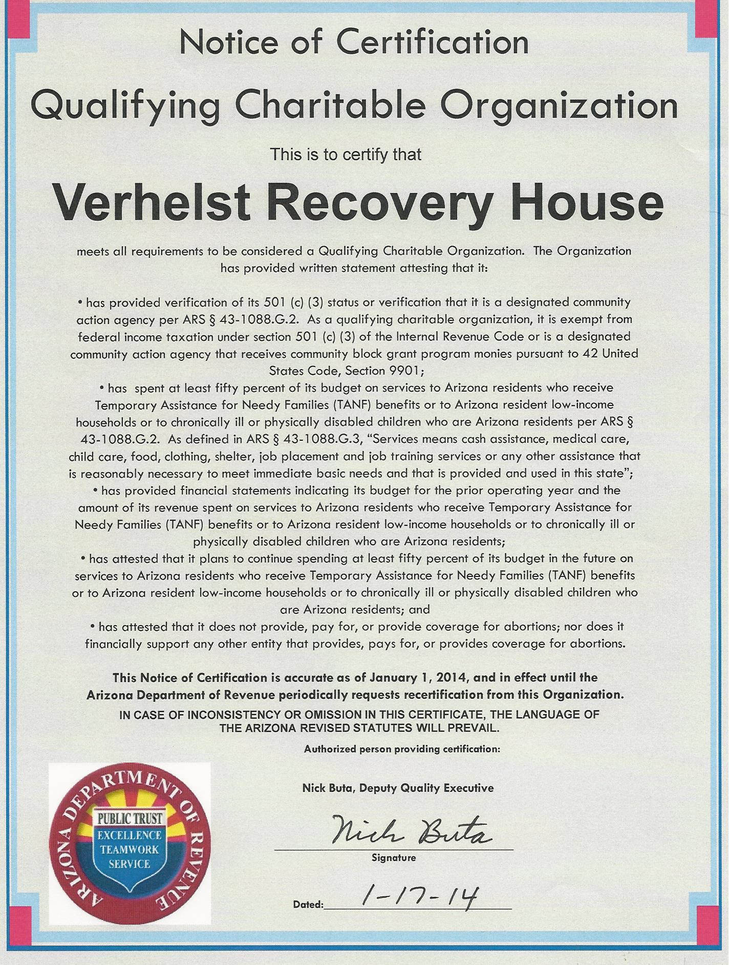 Verhelst Recovery House Arizona Qualifying Charitable Organization Document